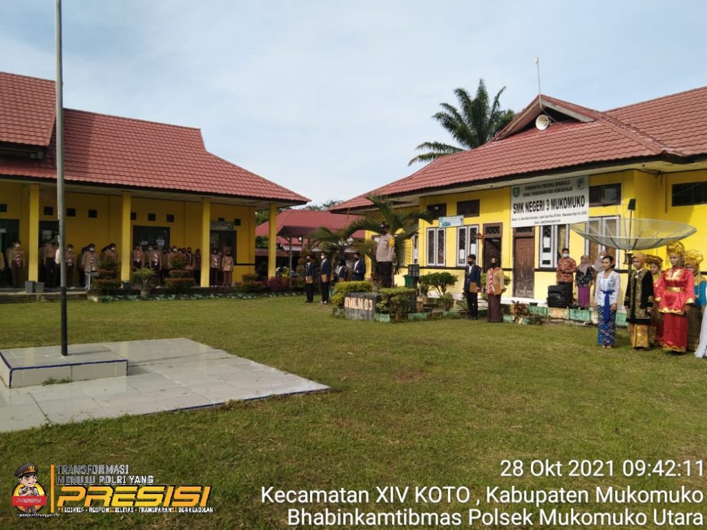 MUKOMUKO – Bertindak sebagai Pembina Upacara dalam rangka memperingati Hari Sumpah Pemuda ke 93 yang digelar SMKN 3 Mukomuko pagi kemarin Kamis (28/10), Anggota Bhabinkamtibmas Polsek Mukomuko Utara AIPTU Mulyadi memberikan himbauan tentang prokes.