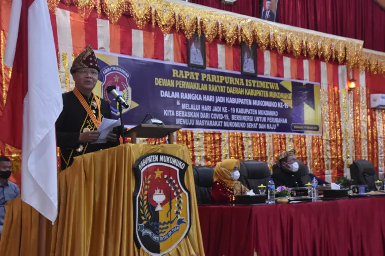 Sebagai bagian dari rangkatan peringatan Hari Jadi ke-19 Kabupaten Mukomuko, Bupati Mukomuko H. Sapuan, SE, MM, Ak, CA, CPA menghadiri Rapat Paripurna Istimewa DPRD Mukomuko, Kamis (24/2/2022). Ikut serta, Wakil Bupati Mukomuko, Wasri, Penjabat Sekda Mukomuko Drs. Yandaryat Priendiana, Ketua TP PKK Mukomuko Ny. Hj. T. Nurliyana Habsjah, SE, M.Pd. Kegiatan berlangsung khidmat itu, juga dihadiri langsung Gubernur Bengkulu Dr. H. Rohidin Mersyah.