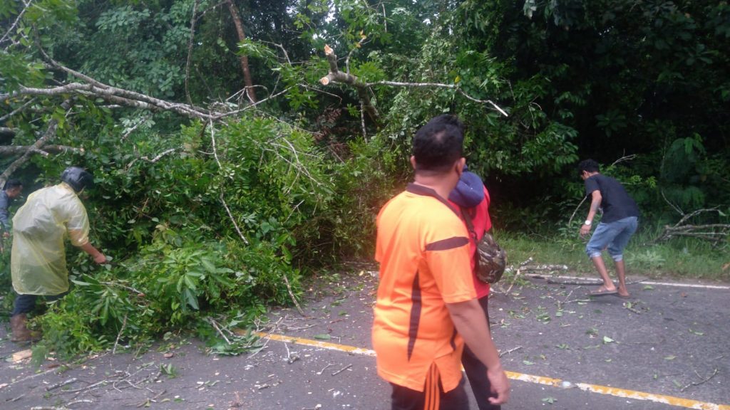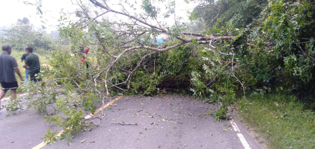 PERSPEKTIFTODAY | MUARO JAMBI-Angin kencang dan hujan lebat mengakibatkan pohon tumbang dan membuat macet arus lalu lintas Jalan lintas Jambi – Merlung Km 29 Bukit Baling Kec Sekernan Kab Muaro Jambi,Kamis 17/03/22