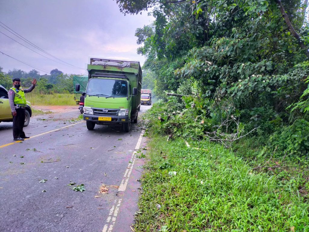 Satlantas polres Muaro Jambi yang sedang bertugas patroli rutin dengan kondisi cuaca yang tidak bersahabat langsung mengambil tindakan mengatur arus lalulintas dan memotong pohon yang menutupi jalan