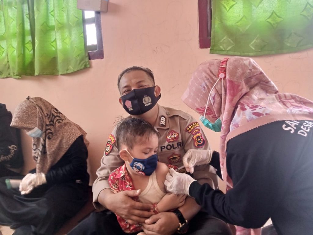 Perspektiftoday Muaro Jambi-Kapolres Muaro Jambi AKBP .Yuyan Priatmaja.SIK.MH melalui Kasi Humas AKP. Amradi. SE mengatakan Babinkamtibmas desa manunggal jaya Bripka Dodi mendampngi anak-anak yang di vaksin di SD Pertiwi desa manunggal jaya kecamatan sungai Bahar dengan membujuk ,kasih sayang serta memeluk anak yang divaksin.