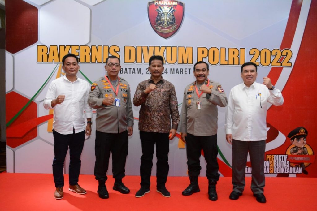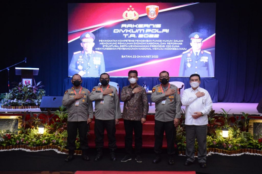 Perspektiftoday | Batam_Rapat Kerja Teknis Divisi Hukum Polri Tahun Anggaran 2022 mengangkat tema “Peningkatan Kompetensi Pengembangan fungsi hukum dalam mendukung pemulihan ekonomi nasional dan reformasi struktural serta mengamankan Presiden G20 guna mensukseskan pembangunan nasional menuju Indonesia maju” dihadiri oleh Karosundokinfokum Drs. H. Yan Fitri Halimansyah, M.H., Karo Bankum Brigjen. Pol. Imam Sayuti, S.H., M.H., M.B.L., para pejabat Divisi Hukum Polri, Para Kabid Kum jajaran dan para perwira Bidang Hukum Polda Kepri, kegiatan dilaksanakan di Ballroom hotel Pasifik, Kota Batam pada Selasa, (22/3/2022).