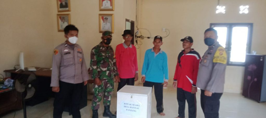Pengamanan surat suara dari Bhabinkamtibmas Aipda Eko bersama Perangkat Desa Rantau Panjang, Babinsa dan Ketua BPD Desa Rantau dan petugas PAM TPS lainnya.