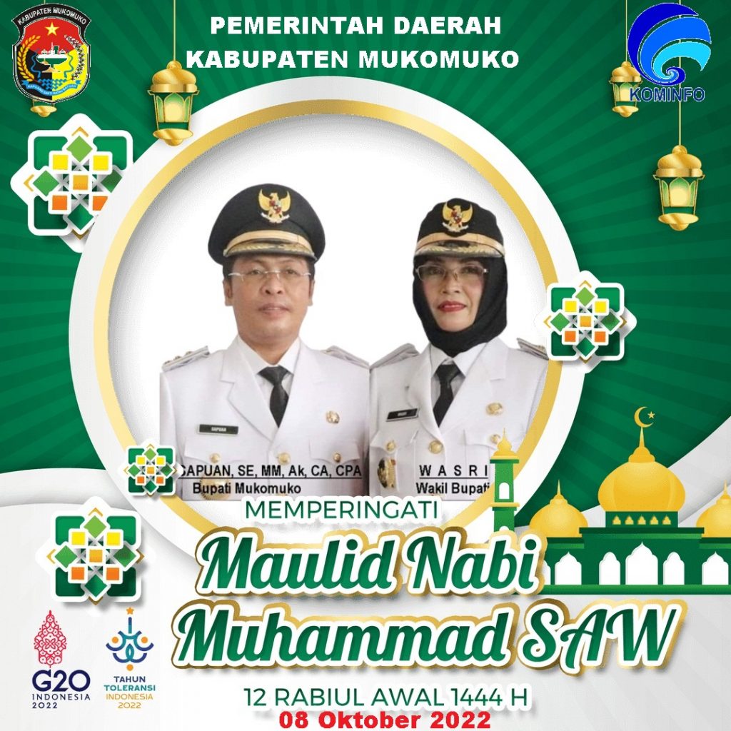 Pemerintah Daerah Kabupaten Mukomuko Mengucapkan Selamat Memperingati Maulid Nabi Muhammad SAW Tahun 2022_Tingkatkan Kinerja dan Kerja Profesional Dengan Penuh Amanah