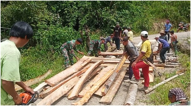 Perspektiftoday | Sanggau, Kalbar – Bencana alam tanah longsor yang mengakibatkan putusnya jembatan yang berada di titik Jalan Inspeksi Patroli Perbatasan (JIPP) Di Wilayah Pertengahan Antara Kampung Guntembawang Dan Kampung Gunjemak, Kecamatan Entikong Kabupaten Sanggau Kalimantan Barat, dipimpin langsung oleh Danpos Guntembawang Satgas Pamtas RI-MLY Yonif 645/Gardatama Yudha Letda Inf Jhon Arthur H Sinaga beserta 5 (lima) orang anggota bersama-bersama dengan warga masyarakat Guntembawang dan masyarakat Gunjemak, membangun Jembatan darurat dari Kayu.