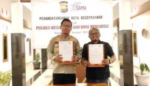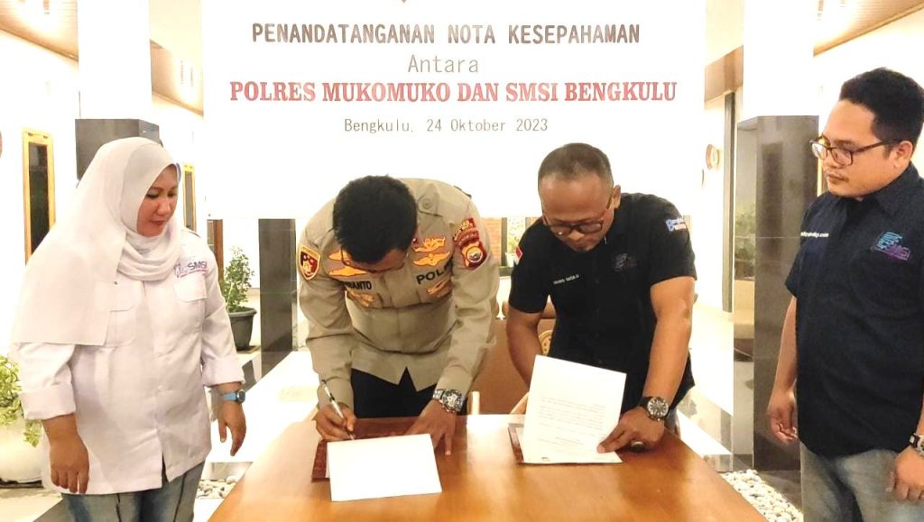 Perspektiftoday | Mukomuko-Kapolres Mukomuko Polda Bengkulu AKBP Nuswanto, S. H, S. I. K, M.H., dan Ketua Serikat Media Siber Indonesia (SMSI) Provinsi Bengkulu Wibowo Susilo menandatangani nota kesepahaman atau perjanjian kerjasama, di Bengkulu, Selasa (24/10/2023).